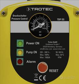L'interruttore a pressione elettronico TDP DS di TROTEC è la soluzione per il controllo automatico di pompe per pozzi profondi, pompe da giardino, pompe centrifughe o pompe dell'acqua senza la propria spina di alimentazione. ad esempio per l'irrigazione del giardino, per l'approvvigionamento idrico domestico, per il trasporto di acqua, per pompare quantità di acqua da una piscina o per lavori di pulizia.