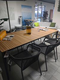 Tavolo U-Nite 220x100 piano teak con 6 poltrone Samba bronze.