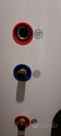 Puffer, accumulo da 200 litri con 2 serpentine, resistenza elettrica riscaldante con termostato, valvola di non ritorno e valvola di sicurezza.
