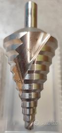 Vendo Fresa conica a gradini professionale di alta precisione ABC, quasi nuova, usata solo una volta e si vede nel dettaglio che non ha usura. Adatta con impiego di trapani e avvitatori per effettuare fori o allargarli su metalli, lamiere e materie plastiche; scanalature rettificate dal pieno a forma di spirale dinamica per un'evacuazione ottimale dei trucioli; profilo affilato ideale per realizzare fori dal pieno e ottima capacità di taglio anche a secco, durezza e durata della punta superiore, che consente di ottenere taglienti a spigolo vivo e senza bava; valori del diametro di foratura indicati sulla scanalatura - angolo del gradino a 90°; in acciaio super rapido HSS e angolo di affilatura 118°.