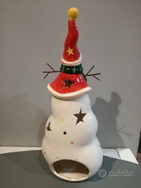 Portatlight in ceramica raffigurante un pupazzo di neve natalizio adatto come illuminazione su balconi e giardini, all'interno bisogna fare attenzione alla candela.