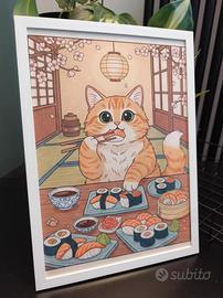 quadro poster con cornice inclusa. gatto mangia sushi. dimensioni 21 x 30 cm.