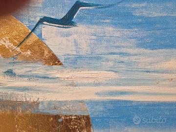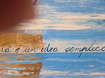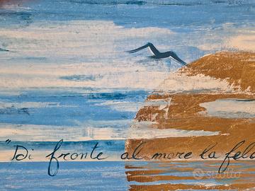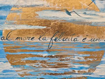 Quadro moderno con marina stilizzato, cm totali 94x64,5, con telaio incluso a parte cm 90x60 da montare. Tecnica mista e foglia oro con scritta a mano "Di fronte al mare la felicità è un'idea semplice".