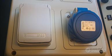 Quadro Schneider industriale 8 moduli per 4 prese incasso IP65 10364 8 moduli Potenza dissipata 15W Corrente nominale 63A Tipo di guida: DIN Grado di protezione IP65 conforme a IEC 60529 Presa interbloccata Gewiss verticale 2P+T 16A IP55 GW66470 Tensionenominale: 200-250V Corrente nominale 16A Numero poli: 2P+T Frequenza 50/60 Hz Protezione: NO (SBF) Grado di protezione IP55 Presa Schneider incasso presa schuko 2P+T 230V Tensione di esercizio nominale250V Corrente nominale 10A 16A Frequenza di rete: 50/60 Hz Tipo di rete: CA Poli: 2P+T A bassa tensione Merlin Gerin 24908 Interruttore Miniatura - C60H - 4 Poli - 0,5 A - Curva + 2 interruttori per luce + magneto termico per accendere P46 xH23 x L18 €70