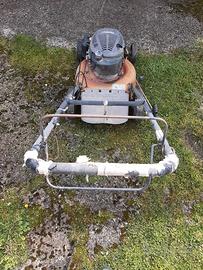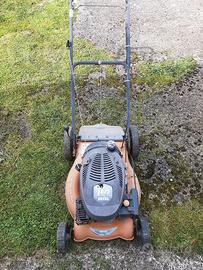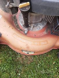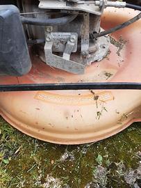 Rasaerba semovente a scoppio. Si avvia al primo colpo ma non funziona la trazione perché si è allentato il cavo. Bisogna sostituire anche il tappo del serbatoio.