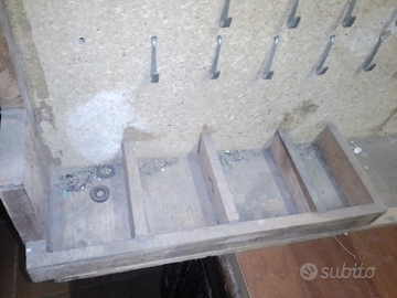 Vendo rastrelliera porta attrezzi in legno dimensioni 100*40. Con molto spazio per appendere qualsiasi attrezzo. Molto ben costruita. Ho i ganci che in foto mancano. Comoda mensola inferiore con scomparti per riporre le cose.