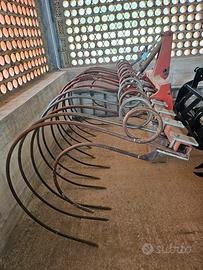 Rastrello a molle per la raccolta di sarmenti e potature, attacco a tre punti, composto da 12 molle più le 2 piccole laterali di chiusura, apertura e chiusura per scarico con martinetto idraulico a doppio effetto, larghezza di lavoro 2 m.