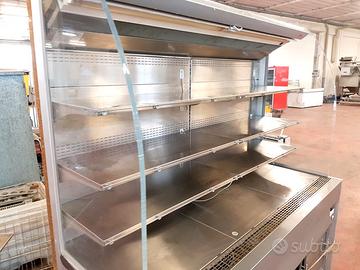 retrobanco per salumi e formaggi usato, si tratta di un espositore verticale in acciaio inox adatto per salumi, prosciutti e formaggi. è dotato di tendina per il mantenimento della temperatura e di vano magazzino. dev'essere dotato di impianto remoto o centralizzato (non incluso nell'offerta)