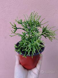 Priva di spine, presenta fusti molto sottili e ramificati, con radici aeree alle ascelle dei rami, produce piccoli fiorellini color panna.