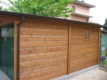 Rimessa con struttura in legno lamellare a telaio, sez. pilastri cm. 10*12, traviportanti e colmo cm. 10*20, pareti con perlina da mm. 32, copertura a due falde con perlina da mm. 32 e impermeabilizzazione con doppia guaina. Finestra apriìbile cm. 50x50. Impregnatura e finitura cerata. Dimensioni standard cm. 500*300. Possibilità qualsiasi misura. Trasporto e montaggio a destinazione. Porta basculante a richiesta. a Parire da ? 4.500