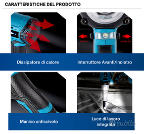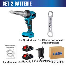 FANTOK Pistola per rivetti elettrica Brushless • MOTORE BRUSHLESS Rispetto al motore con spazzole, non avrà scintilla e non sarà necessario sostituire le spazzole di carbone, garantendoti molta sicurezza e comodità. Il motore Brushless consente allo strumento di funzionare più efficiente del 50% e con una maggiore durata. • FUNZIONAMENTO AUTOMATICO Dotato di funzionamento intelligente, permette con un solo pulsante il funzionamento, semplice e veloce, richiede solo 3-5 secondi per tiraggio (dipende dai materiali dei rivetti). • BASSO RUMORE E PRESTAZIONI ELEVATE Questa rivettatrice offre un ambiente di lavoro relativamente silenzioso e potente prestazioni, non si avrà il rumore di un compressore d'aria sul posto di lavoro. • AMPIAMENTE USATO La pistola può essere utilizzata per rivetti in alluminio. Adatto per i seguenti innesti: da 2,4 a 5,0 mm, ideale per il settore automobilistico, dell'edilizia e lavori di assemblaggio. SPECIFICHE TECNICHE • POTENZA MASSIMA: 300W • DIMENSIONE RIVETTO APPLICABILE: 1.4~5.0 MM • DIMENSIONE INNESTI: 2.4MM, 3.2MM, 4.0MM, 4.8MM • FORZA DI TRAZIONE MASSIMA: 20000 N • COPPIA MASSIMA: 180 NM • VOLTAGGIO BATTERIA: 20 V • CAPACITÀ BATTERIA: 1.5 AH • MOTORE ELETTRICO: BRUSHLESS • PESO: 1.16 KG (solo corpo pistola) SET 2 BATTERIE 1 Pistola, 2 Batterie, 1 Caricabatterie, 1 Chiave con innesti intercabiabili, 1 scatola di cartone (di spedizione) con gommapiuma sagomata.