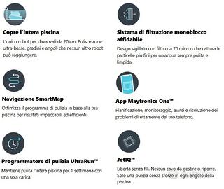 Dolphin Eon 100i Senza Fili Cordless - Bluetooth / Wi-Fi - APP Maytronics One - JetIQ - UltraRun – SmartMap - Robot Piscina a Batteria fino a 15 Mt – NOVITA’ Copertura totale della piscina — anche dove gli altri non arrivano Il Dolphin EON 100 è il primo robot pulitore cordless che raggiunge davvero ogni superficie: mensole solari da soli 20 cm, scale, angoli, pareti e linea d'acqua. Grazie alla navigazione SmartMap e alla tecnologia JetIQ, nessun centimetro viene ignorato. Gestisci tutto dal tuo smartphone Con l'app Maytronics One™, hai il pieno controllo del tuo Dolphin EON ovunque tu sia. Connessione tramite Bluetooth e Wi-Fi. Programma i cicli di pulizia: imposta la frequenza e lascia fare a EON. Monitora lo stato in tempo reale: controlla il progresso della pulizia. Ricevi notifiche: avvisi di completamento, errori e manutenzione. Risolvi problemi: diagnostica e supporto direttamente dall'app. Caratteristiche Tecniche — Dolphin EON 100 Piscina15 m Fondo, Pareti, Linea di Galleggiamento, Mensole solari, Spiaggette, Scale e Angoli Interrata & Fuoriterra Rettangolare, Rotonda, Forma Libera, Fagiolo liner, gunite, acciaio inox, ceramica, mosaico, vetro, vetroresina e piastrelle 20cm - 3m Ciclo di puliziapre-impostato 2 h (possibilità di scegliere tra 1,5/2/2,5 ore) Fino a 1 settimana con una carica Sì — tramite UltraRun Scheduler FiltrazioneFiltro Fine Monoblock 70 micron Dall'alto (Top Access) SpazzoleSì — Spazzola standard 2 ConnettivitàMaytronics One (Bluetooth + Wi-Fi) Bluetooth + Wi-Fi NavigazioneSmartMap Navigation JetIQ™ •Spiaggia •Indicatore di temperature •Filtro intasato (2 livelli) •Homing Autonomia3,5 ore Struttura10 kg 56 x 45 x 31,5 cm Batteria agli Ioni di litio 6000mAh Garanzia2 anni Consegna Espressa gratuita in 24/96 ore lavorative