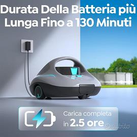 Robot Per Piscina Fuori Terra e Interrata, Ricarica Rapida 2.5 Ore, Autonomia 130 Mins, Doppia Trazione, Pulizia Potente, Adatto per Piscine fino a 80 m² PRODOTTO NUOVO IMBALLATO! PREZZO DI LISTINO 180 EURO! Ricarica Rapida e Comoda: Il pulitore piscina Pleco Se è equipaggiato con una potente batteria da 5200 mAh che si ricarica in soli 2,5 ore, pronto per il prossimo utilizzo. Così, puoi goderti una piscina pulita ogni volta che ne hai bisogno, senza lunghe attese! Pulizia Potente e Completa: Grazie al motore a doppia trazione e al filtro da 180 μm, il robot è in grado di rimuovere facilmente polvere, sabbia, foglie e altri detriti. Potrai rilassarti completamente e non sentirti più stanco. Lunga Autonomia: Con 130 minuti di autonomia, questo robot è ideale per piscine fino a 80 m². Funziona su ogni tipo di rivestimento (PVC, piastrelle, vinile o cemento) e forma (rotonda, rettangolare o ovale), per adattarsi perfettamente alle tue esigenze. Ritorno Automatico al Bordo: Quando la batteria scende sotto il 15%, il robot piscina ritorna autonomamente al bordo della piscina. Rendi il tuo robot pulitore per piscine più comodo da usare. Facilità d'uso Totale: Pleco Se è un pulitore piscina fuori terra senza fili che ti offre una pulizia semplice e veloce. Basta premere un tasto e il gioco è fatto! È leggero, facile da riporre e più pratico rispetto ai modelli con cavo, rendendo la gestione della piscina ancora più facile.
