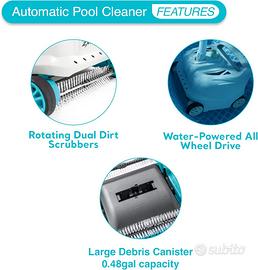 Facile da utilizzare, il Robot Pulitore Automatico ZX300 consente di pulire automaticamente e in modo efficiente il fondo della piscina. Si muove utilizzando la forza della pompa filtro, che reimmette l’acqua depurata all’interno della piscina. Grazie al rapido movimento delle doppie spazzole rotanti, il robot raccoglierà detriti, foglie e insetti che si depositano sul fondo, garantendo una pulizia profonda. Robusto e dalle ottime prestazioni, è ideale per le piscine dalle grandi dimensioni: ha la particolarità di potersi appoggiare alle pareti della piscina in modo da aspirare efficacemente tutte le impurità fino alla linea di galleggiamento. Adatto a qualsiasi tipo di piscina con diametro massimo di 6 metri. Può essere applicato a pompe filtro con portata da 6056 a 13248 L/h. Tubo in dotazione (6,5 m).