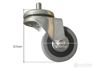 Kit di 6 Ruote in plastica con parafili, ricoperta in gomma grigia antitraccia diametro mm.50, montata su supporto girevole con perno filettato M8 x 15mm H, adatta per movimentazione e trasporto apparecchiature a traslazione esclusivamente manuale che operano all’interno di edifici come, espositori, attrezzature per ristoranti, carrelli porta oggetti, apparecchiature per ufficio, mobilio medico, elettrodomestici, carrelli per comunità, mobili, stender porta abiti, utensili, elettrodomestici, oggetti d'arredamento.