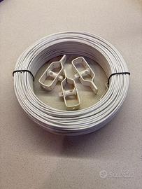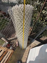 Rotolo rete maglia sciolta rombo 50x50mm, h150cm, colore bianco. Incluso 100mt di filo plastificato bianco e 3 tendifilo bianchi, tutto materiale per la posa. Preferisco la consegna a mano visto le dimensioni e il peso. Eventualmente accordabile consegna via corriere.