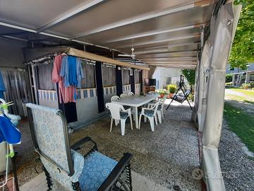 Vendo roulotte Adria 460, anno 1991, 4 posti letto, unico proprietario, stanziale dal 1999. Dispone di letto 1 piazza e mezza fisso + 1 dinette trasformata in letto fisso, materassi a molle e memory foam sostituiti nel 2023. Bagno con wc completo di sanitrit e scarico diretto, acqua corrente nel lavandino. Piano cottura e frigorifero non più utilizzati dal 1999. Veranda fissa invernale "Brembo Verande ", rifatta nel 2019, 5 finestre con zanzariere, cristal e oscuranti. La veranda misura 5 mt x 2.5 mt ed è interamente perlinata anche a soffitto, isolato con lastre di polistitolo tra le perline e il tetto. Pavimento flottante. In veranda sono presenti piano cottura e lavello con acqua corrente, scaldabagno per acqua calda, frigorifero, fornetto elettrico e microonde, mobile dispensa, stufa catalitica s gas, divano, tavolo con panche. Il tutto è ricoperto da veranda esterna, richiudibile con teli cristal che creano un ulteriore ambiente, oltre che protezione in caso di pioggia e durante la stagione invernale. È presente un comodo magazzino per stoccaggio e ricovero attrezzi . La veranda esterna misura 7 mt x 5 mt. Si vende completa di tutto quanto descritto e in foto, oltre a sacchi a pelo e biancheria letto, stoviglie, pentolame e suppellettili, tavolo esterno bianco con 8 sedie, dondolo e TV con antenna, piastrelloni in graniglia per pavimentazione esterna. Visibile presso il campeggio Lago Maggiore Village di Dormelletto. Ottima occasione per chi desidera creare un angolo di relax in qualsiasi campeggio della zona o in montagna. Per contatto 349 772 4662