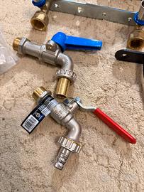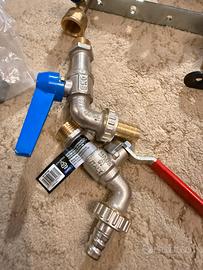 Vendo set di due rubinetti a sfera con portagomma, ideali per giardino, orto o collegamento a tubi di irrigazione. Realizzati in ottone nichelato per durabilità e resistenza alla corrosione, garantiscono un flusso d’acqua controllato e sicuro. Le leve colorate (rosso e blu) indicano facilmente la posizione di apertura e chiusura dell’acqua.