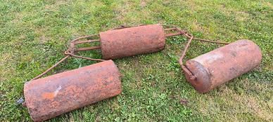 Condizioni: Come visibile in foto, i rulli sono in metallo/cemento con un'importante patina di ruggine che ne testimonia l'età e l'autenticità. La struttura è integra ma necessita di restauro se si desidera utilizzarli per la loro funzione originale di compattazione del terreno.