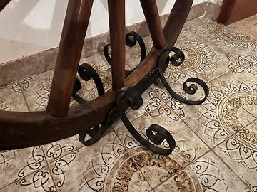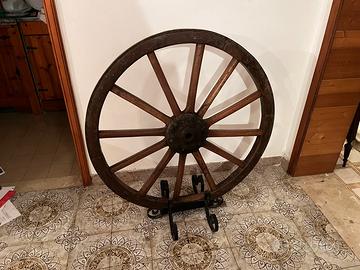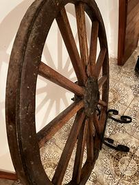 Aantica ruota carro in legno con stand in ferro battuto lavorato.