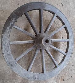 Vendo antica ruota di legno per carro, in ottimo stato. Ha 12 raggi in legno, il diametro è 103 cm ed il battistrada insieme al mozzo centrale sono rivestiti in ferro. Il prezzo è leggermente trattabile.