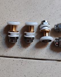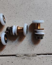 Vendo cuscinetti per box doccia porta scorrevole. Dimensioni ruota 20 mm, spessore ruota: 5,5 mm, lunghezza totale: circa 33 mm. Spessore della porta in vetro applicabile: 4-6 mm. La dimensione per il foro nel vetro 10-12 mm. Disponibilità immediata