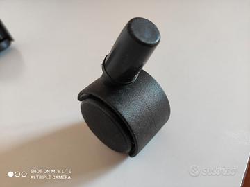 Ruote pivottanti nere in materiale plastico. Diametro ruotino 40 mm. Larghezza 39 mm. Leggere adatte a carrelli e mobili leggeri. Portata max 20 Kg per ruota. Inserimento a pressione su fori o tubi d=15/18 mm. Altre dimensioni su richiesta.