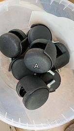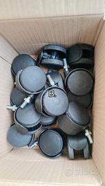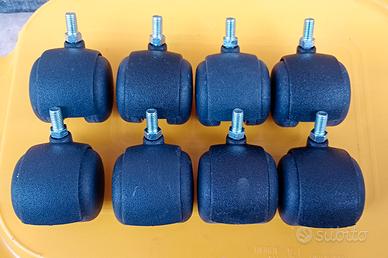 Ruote derivanti da recupero come nuove. Modello A: misura diametro 5 cm larghezza 5.5 cm altezza totale 7,5 cm altezza senza filetto 6,1cm Modello B: Diametro 5 cm larghezza 4,7 cm altezza totale 8 cm altezza senza filetto 6,4. Modello A 8pz. chiedo 10 euro Modello B 16pz. regalo/gratis! Cedo in stock per inutilizzo CONSEGNA SOLO A MANO! NO SPEDIZIONE!