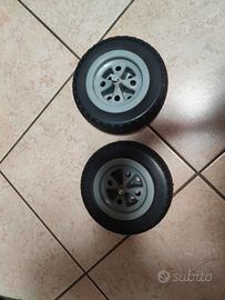 Ruote per carrello Wolkraft o altro NUOVE PIENE senza camera d'aria.Il diametro è da 18 cm il raggio è,dal foro all'esterno 9 cm la larghezza è 5,5 cm.Il foro e da 1 cm ma tramite adattatore si può usare il perno da 6 che è compreso con le ruote.Vendo per errato acquisto.