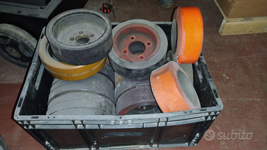 Ruote di trazione, di varie misure (in elenco) per transpallet elettrici e carrelli elevatori, piccoli muletti con ruote dure, piene in gomma.