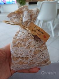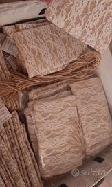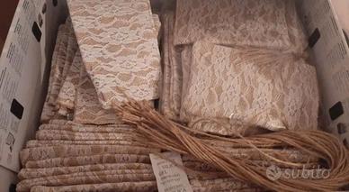 disponibili N 90 sacchetti portaconfetti, materiale iuta ricoperto da pizzo bianco con laccetto per chiusura incluso. misura sacchetto 12 X 10.