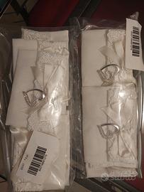 sacchettini porta confetti/bomboniere marca Cuorematto, color crema e pizzo, con cuore argento e strass applicato come da foto. N 2 confezioni ancora sigillate, da 6 sacchettini cad ; tot 12 pezzi.