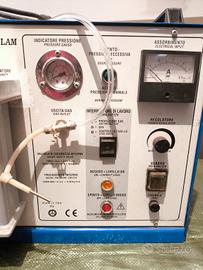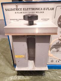 Saldatrici che producono gas infiammabile tramite elettrolisi dell’acqua.Da tale gas, che viene depurato automaticamente dalla macchina, si ottiene una fiamma NON OSSIDANTE di colore verde che sviluppa una caloria di circa 2800°C.Queste saldatrici possono effettuare saldature in pochissimi secondi senza riscaldare completamente il pezzo lavorato e sono particolarmente indicate per gioielleria e oreficeria, odontotecnica, ottica ed elettronica.Tutti i modelli sono strutturati in acciaio con verniciatura antigraffio a forno e sono dotati di doppia valvola automatica di ritegno contro i ritorni di fiamma, pressostato elettronico per il controllo della pressione e valvola di sicurezza di sfiato automatico tarata secondo norme.La strumentazione è completa di interruttore generale, fusibile di protezione, regolatore di potenza , strumento analogico di controllo assorbimento, interruttore controllo livelli/generazione gas, 2 spie controllo livello soluzione elettrolitica, indicatore di pressione, spia controllo pressione, segnalatore acustico sovrapressione/mancanza tensione.Il serbatoio esterno a due stadi, rivestito in RILSAN anticorrosione: primo stadio = separatore di condensa e impurità; secondo stadio = depuratore gas tramite soluzione di metilborato SINTEX.I cannelli sono dotati in testa di rubinetto per la regolazione del gas in uscita.