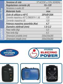 La saldatrice Inverter Hyundai MMA120S è uno dei nuovi modelli che la casa coreana ha immesso sul mercato per la saldatura con elettrodo, a livello professionale e hobbistico, per lavori semplici e leggeri. Viene fornita completa degli accessori che consentono di lavorare fin da subito: cavo di massa, pinza porta-elettrodo, maschera in plastica e spazzola; la struttura è compatta e maneggevole, i comandi facili ed intuitivi così da poter essere utilizzata anche da persone poco esperte.