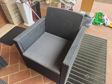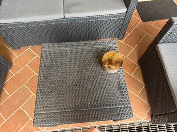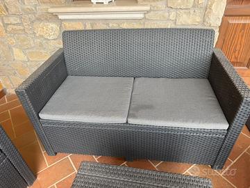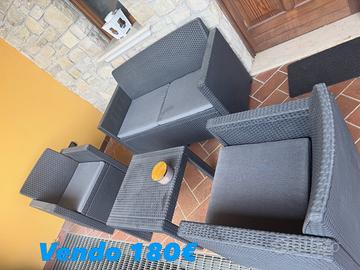 Salottino da esterno composto da divanetto e 2 poltroncine con cuscini + tavolino! Da pulire perché è stato all’esterno