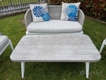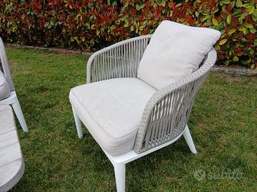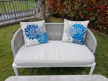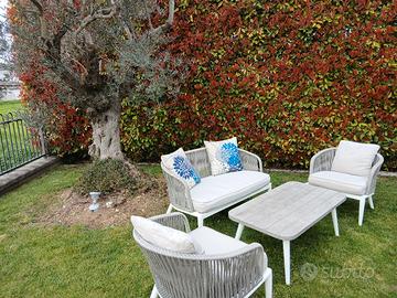 Salottino da esterno composto da un divano,due poltrone e tavolino.Telaio in alluminio,schienali in corda e cuscineria.Peesenta qualche segno d'usura.