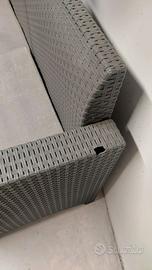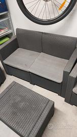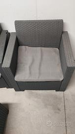 set da esterno in polipropilene. 2 sedute singole, 1 doppia con cuscini e tavolino.