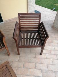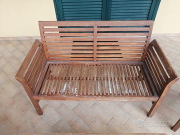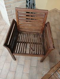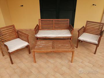 Vendo salottino da giardino in legno composto da: divanetto, due poltrone, un tavolino. Il salottino necessita di essere riverniciato, una poltrona presenta una stecca rotta. Si può facilmente cambiare inoltre ci sono in dotazione i cuscini per il divanetto e le due poltrone bianchi nuovi ancora celofanato mai usati