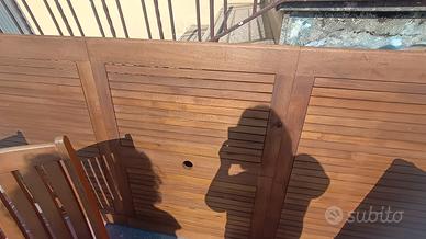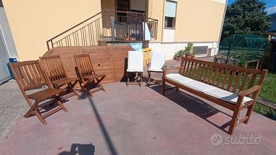 vendo salottino da giardino/veranda. Tavolo allungabile e riducibile, lunghezza massima tre metri, quattro sedie e una con braccioli, panca e cuscini. Marca Greenwood in Teak, bellissimo e tenuto bene.