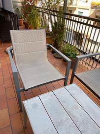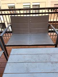 Vendo salottino da giardino, usato poco, da pulire, 1 tavolino, 2 sedie e un divanetto. Metallo e sedute in nylon.