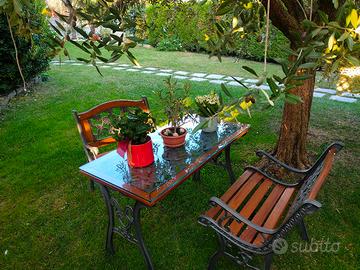 vendo perfettamente restaurato piccolo saltato da giardino in legno e ghisa. Tavolo con vetro temperato e due sedie. Ideale per terrazzi o giardino. Si presenta di grande impatto visivo ed arreda qualsiasi ambiente. Solo ritiro a mano.