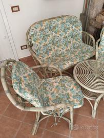 Salottino in vimini con divanetto 2 posti, 2 poltroncine e tavolino rotondo con cuscini.