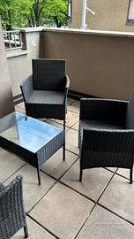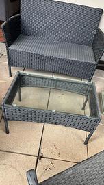 Vendo a prezzo ridicolo salottino mai usato lo avevo messo l’anno scorso in terrazzo per bellezza e per occupare lo spazio come da foto panca 2 posti 2 poltrone e un tavolino con piano in vetro modello tipo rattan ma in materiale resistente tipo plastica non spedisco