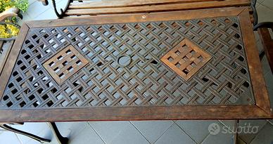 Vendo salotto da esterno composto da 4 pezzi: 2 sedie, una panchina e un tavolo. Realizzato il legno e ghisa. In buone condizioni.