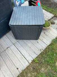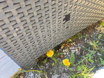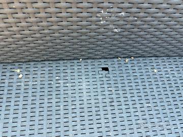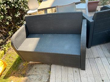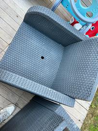 vendo una poltrona, un divanetto e un tavolo contenitore in rattan nero, cuscini compresi, solo due buchi laterali e uno piccolo sotto il cuscino visibili in foto. ritiro solo a mano