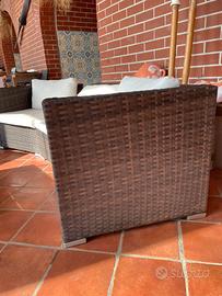Vendesi salotto in polirattan composto da 5 elementi. 3 poltrone un puff ed un tavolino come mostrato in foto. Mai stato all’aperto in condizioni perfette