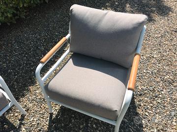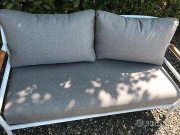 Salotto da esterno con struttura tubolare verniciata a polvere molto resistente alle intemperie. Usato pochissimo infatti, ha ancora attaccate le targhette dell’azienda. Molto comodo e robusto. Parti in legno in teak , come anche il tavolino che do insieme non presente in foto. Vendo anche separatamente. No perditempo. Disponibile per visione in loco e per qualsiasi info. Non viene presa in esame nessun tipo di spedizione.