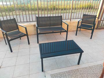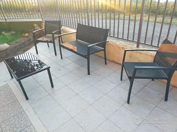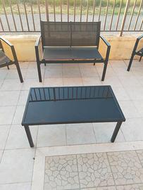 Due poltroncine + divanetto + tavolino con piano in vetro fume'.