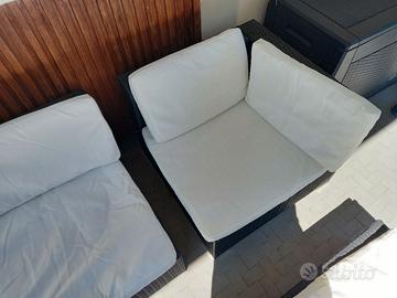 Salotto da giardino in retain nero componibile. Ha sette moduli per sedute e tavolino con piano in vetro. Visto i moduli separati, sono realizzabili diverse configurazioni. Comprende cuscini bianchi. Piedini cromati leggermente rovinati.