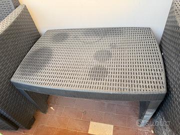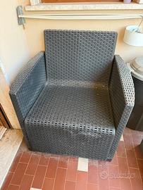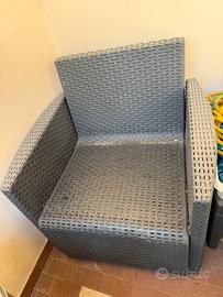 Vendo salotto da giardino in resina effetto rattan composto da: •2 poltrone •1 divano due posti •1 tavolino Struttura in buone condizioni, solo da pulire perché impolverato. Cuscini presenti ma da sostituire. Ideale per balcone, terrazzo o giardino. Venduto in blocco.